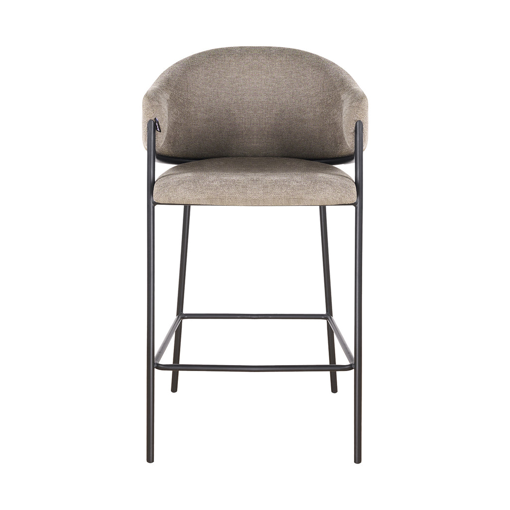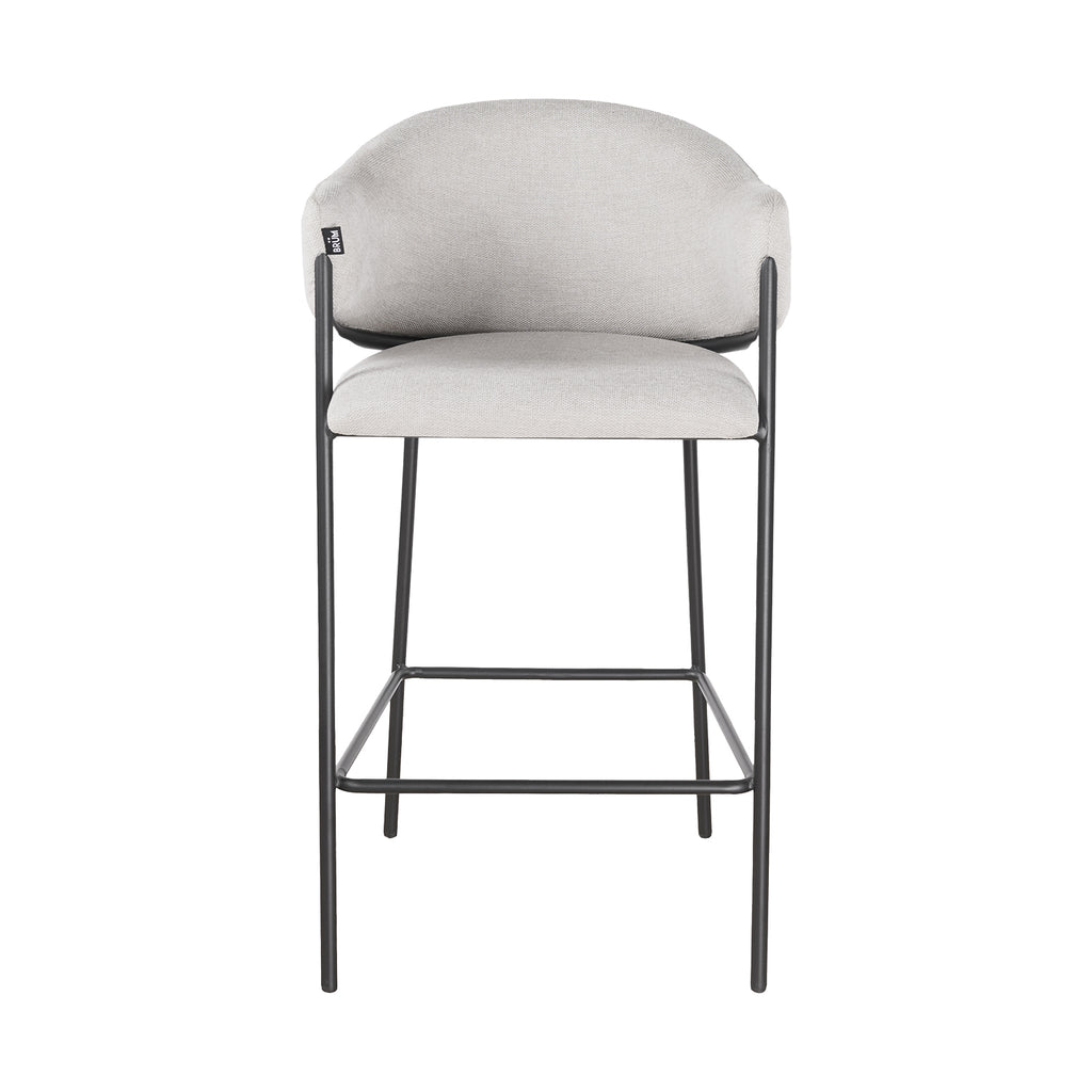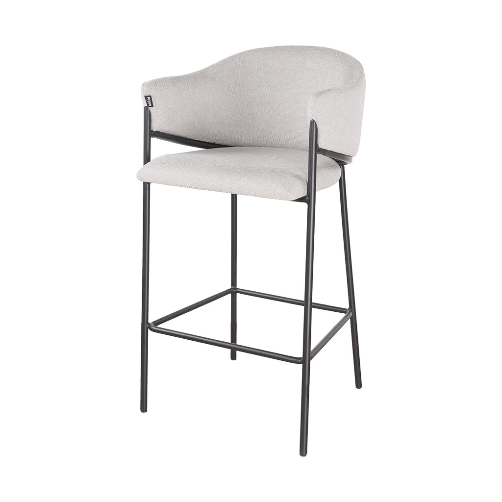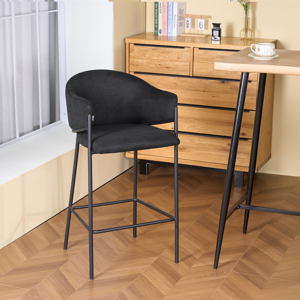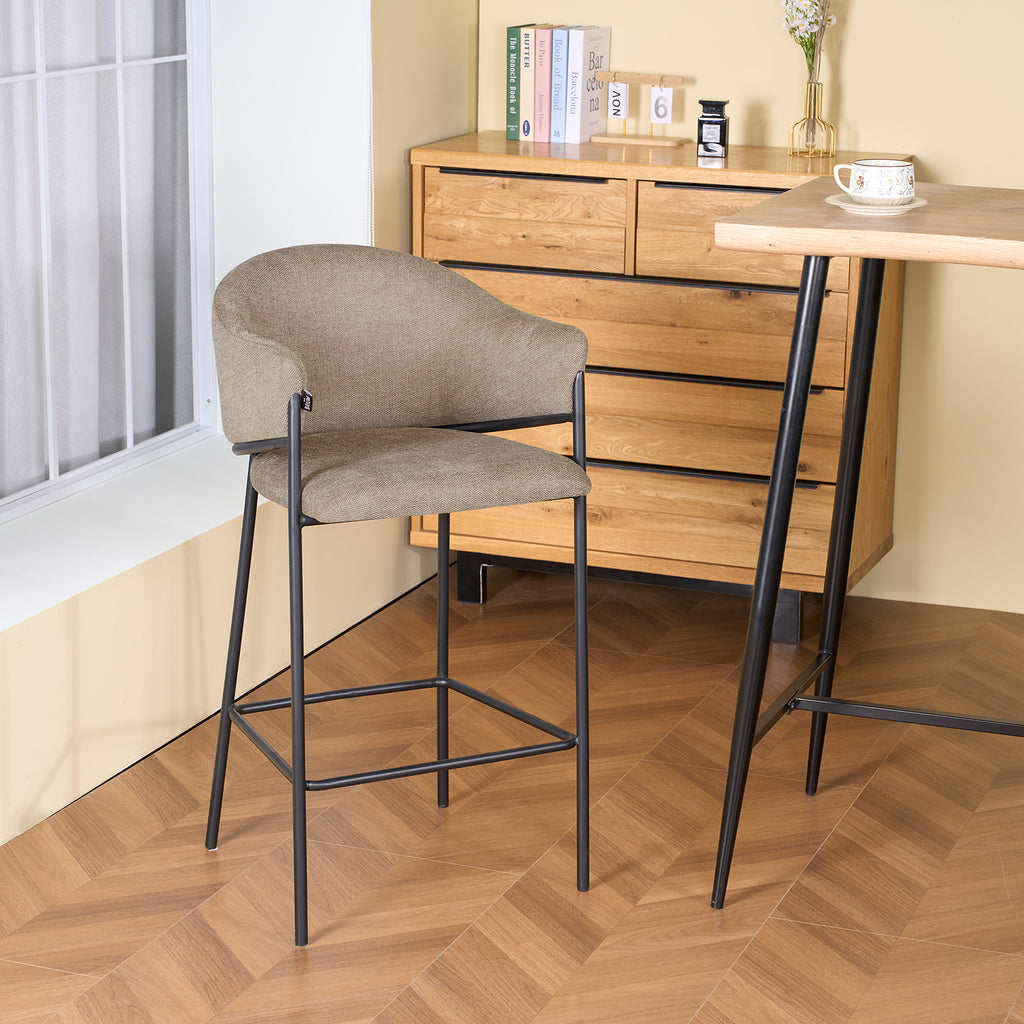 El asiento tapizado ofrece una textura suave y agradable, ideal para disfrutar momentos largos en la barra o la cocina. Su forma estilizada alarga visualmente el espacio y aporta una sensación de armonía que complementa tanto interiores modernos como ambientes industriales o minimalistas.