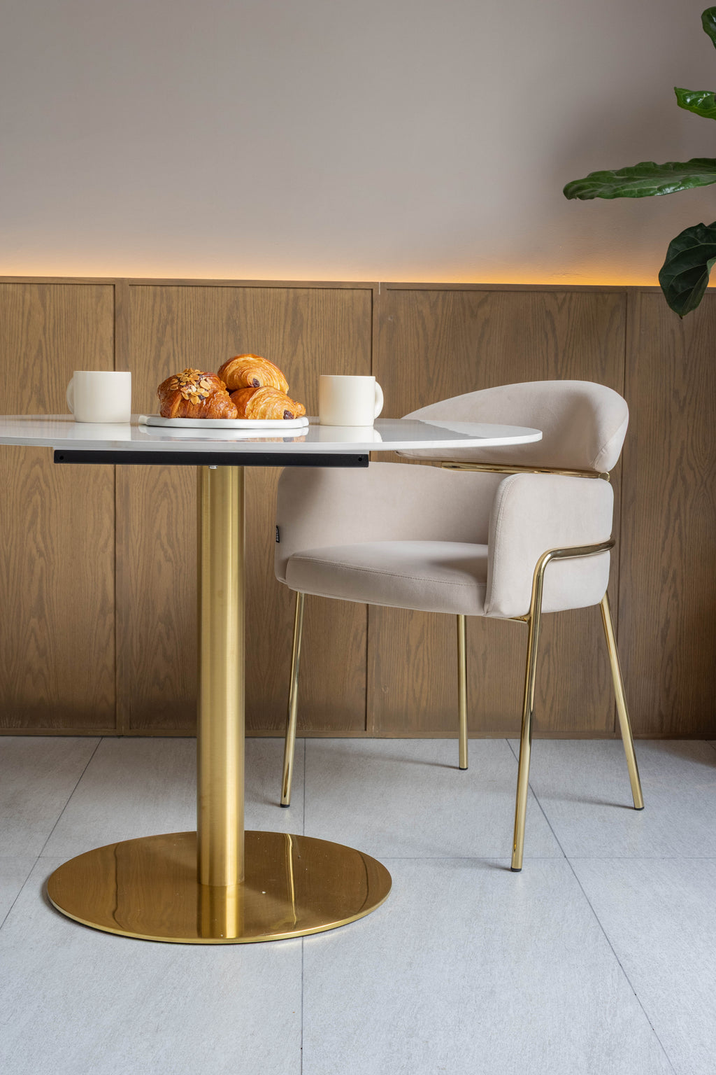 La estructura redonda crea una silueta armoniosa que equilibra lo moderno con lo atemporal, mientras que las patas en cromo dorado aportan un contraste sutil pero impactante. Ese toque metálico le da carácter y presencia, haciendo que destaque ya sea en un comedor, un estudio, o como silla de acento en cualquier rincón especial.