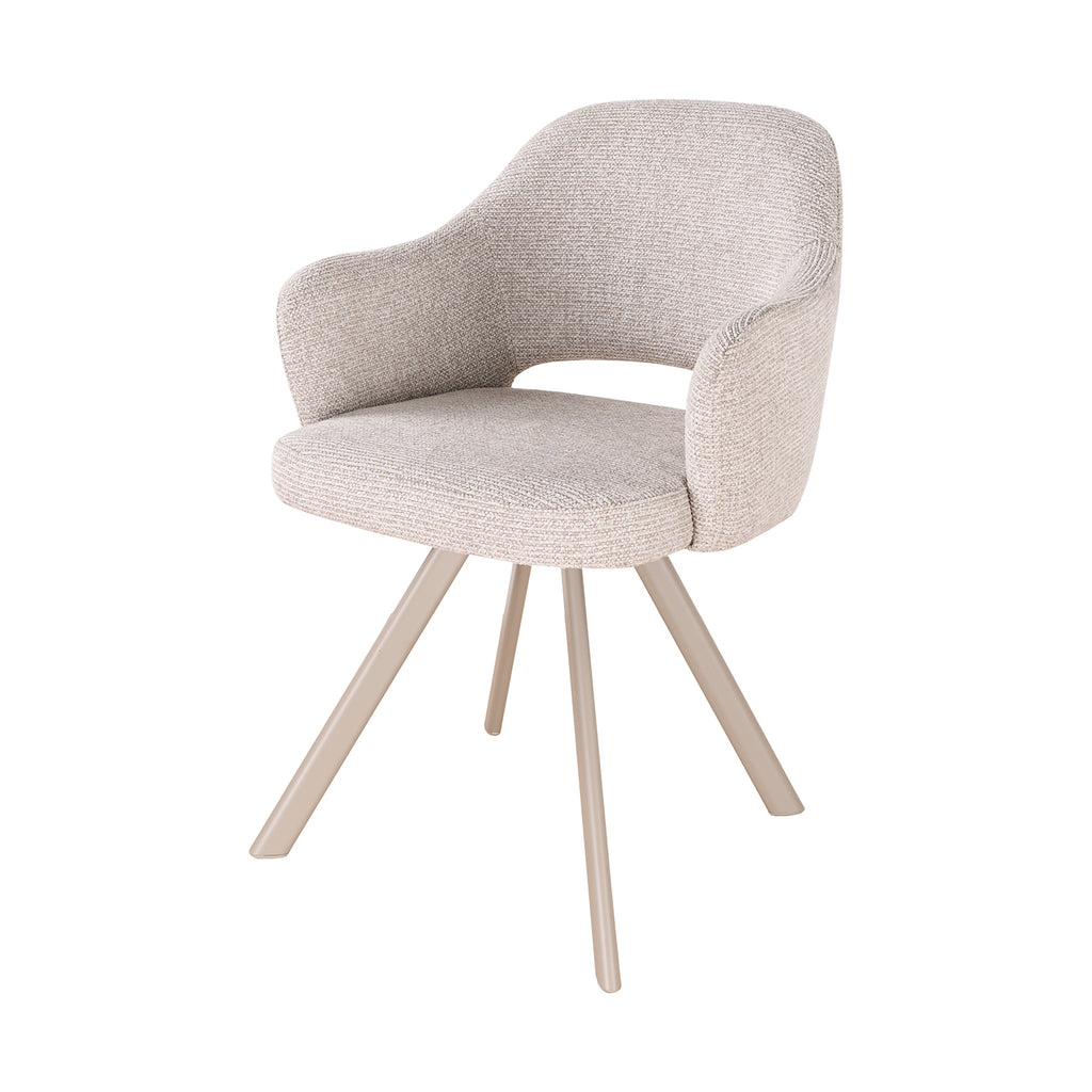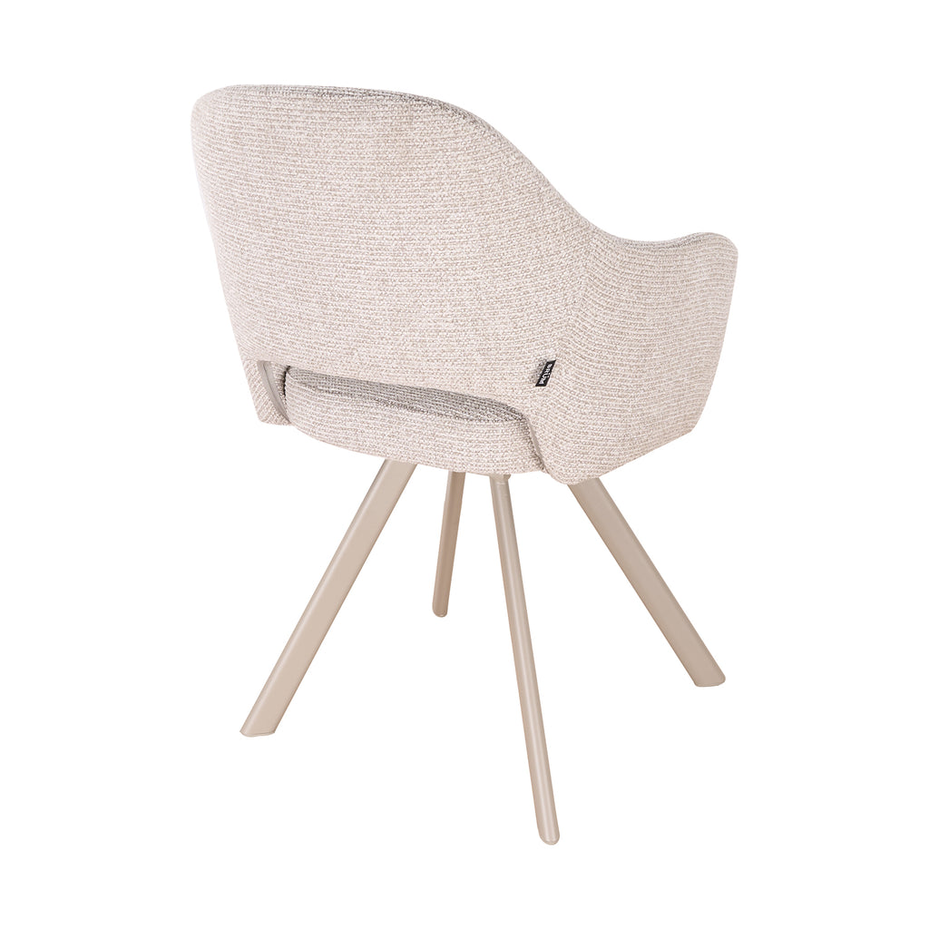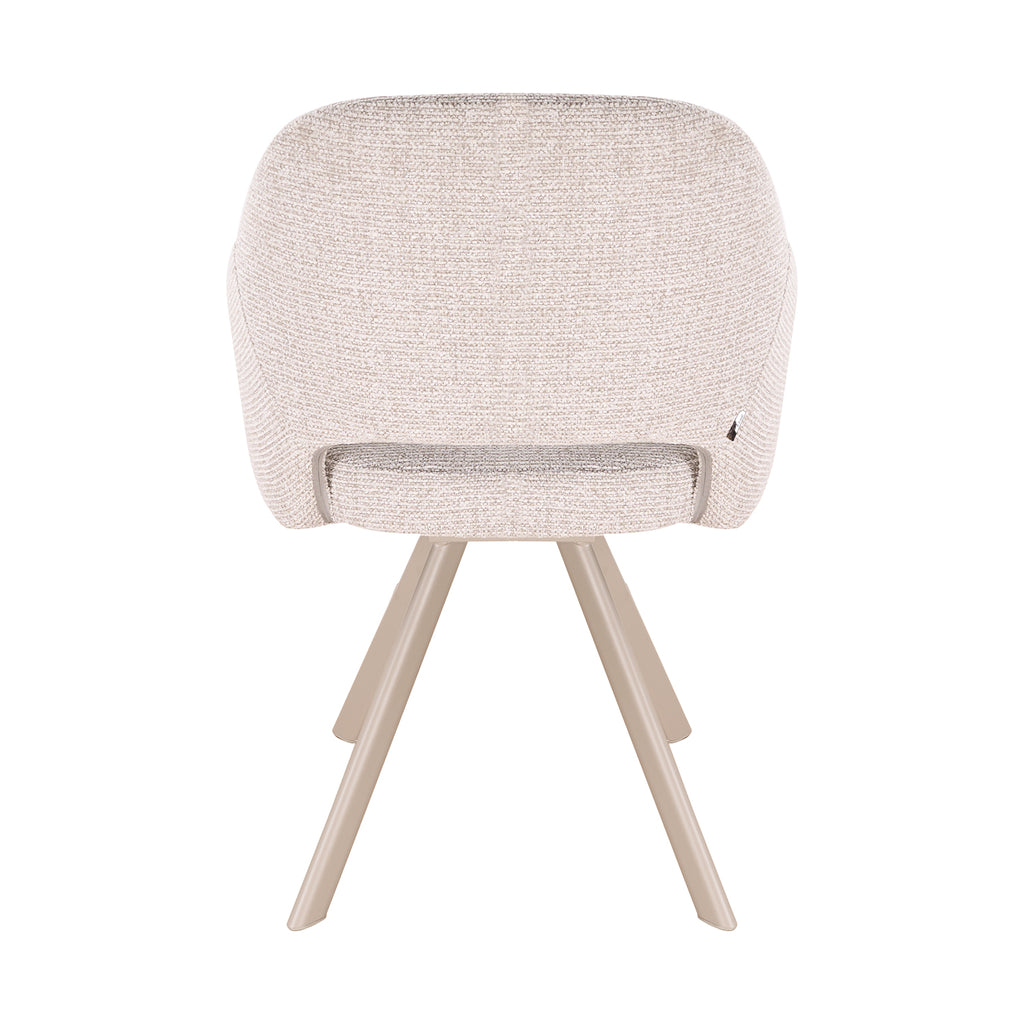 La estructura metálica con patas ovaladas en tono kaki refuerza su estabilidad y aporta un contraste elegante al tapizado. Cada detalle ha sido pensado para equilibrar confort, durabilidad y estilo, logrando una estética moderna y funcional.