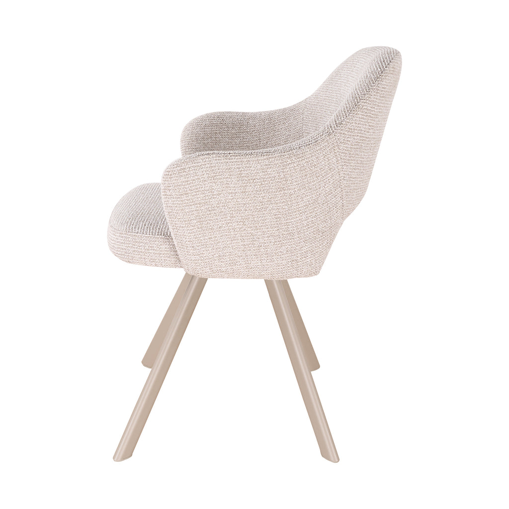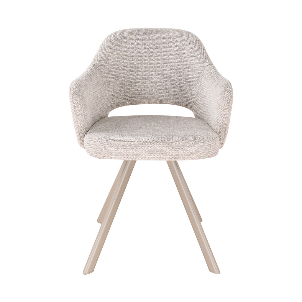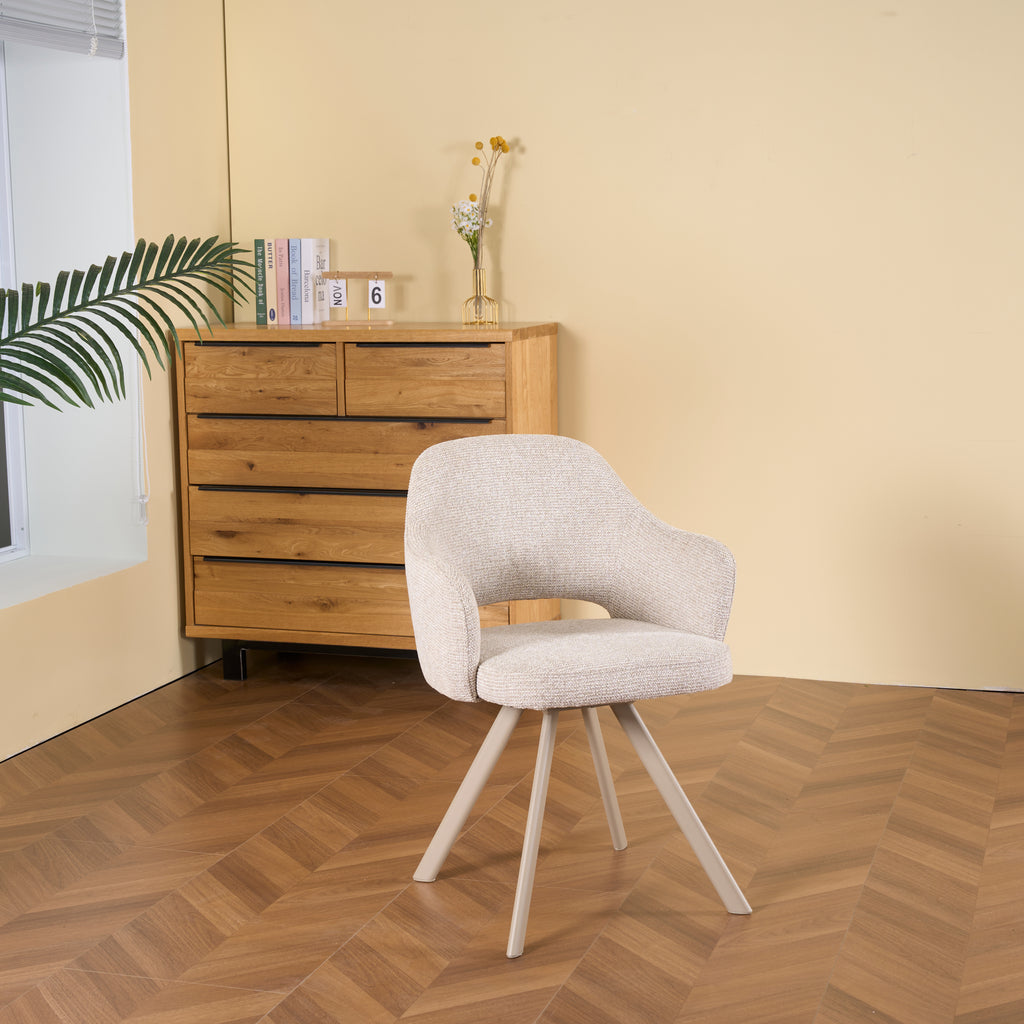 La estructura metálica con patas ovaladas en tono kaki refuerza su estabilidad y aporta un contraste elegante al tapizado. Cada detalle ha sido pensado para equilibrar confort, durabilidad y estilo, logrando una estética moderna y funcional.