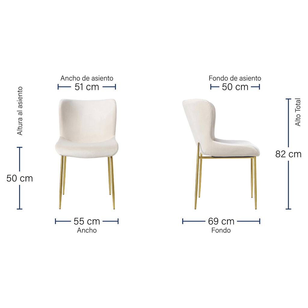 La combinación de velvet y estructura resistente la convierte en una silla estable, cómoda y perfecta para uso diario. Su base tapizada aporta un look uniforme y elegante que la hace destacar dentro del espacio.