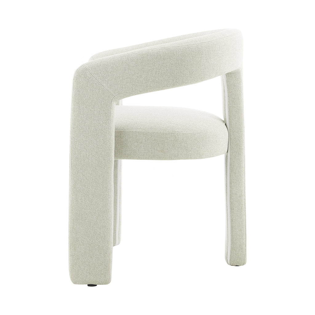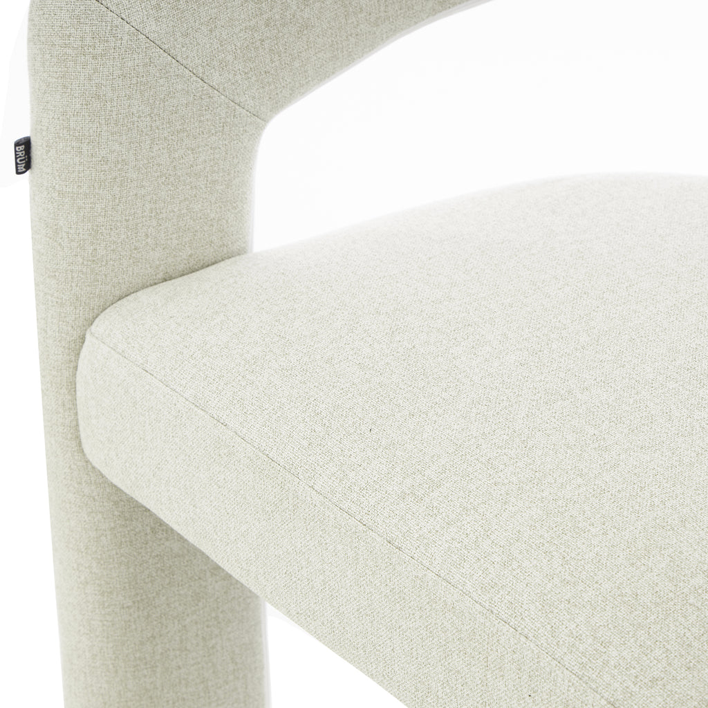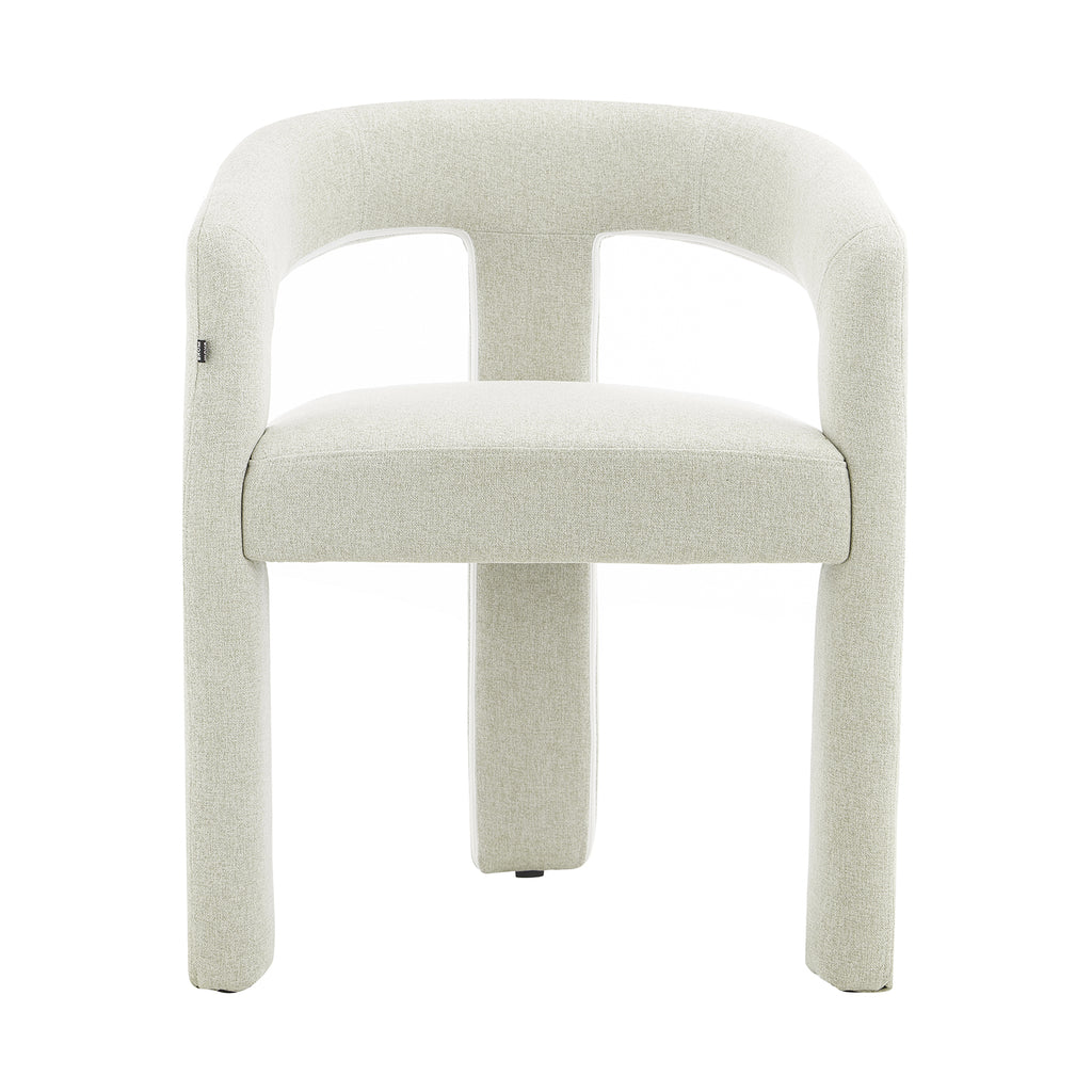 Tapizada en tela premium en tonos crema y beige, su textura aporta calidez y un toque de lujo. Su base estructural es firme y estable, garantizando durabilidad sin perder la ligereza visual que la caracteriza. Su diseño abierto en el respaldo añade frescura y fluidez, creando una sensación de amplitud en cualquier espacio.