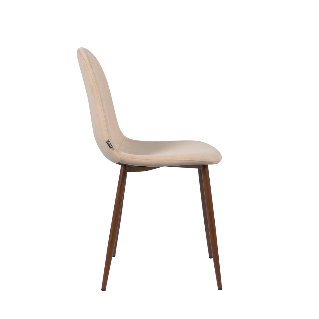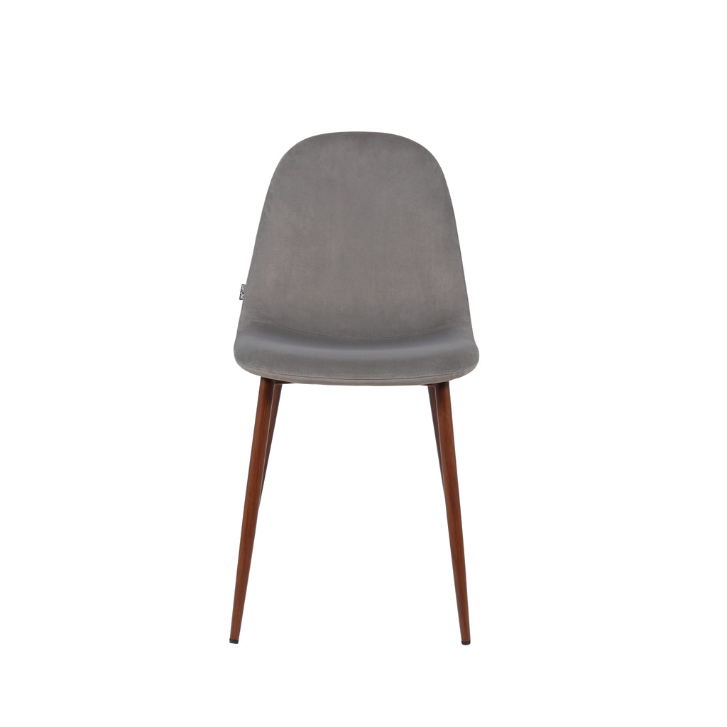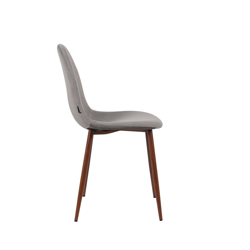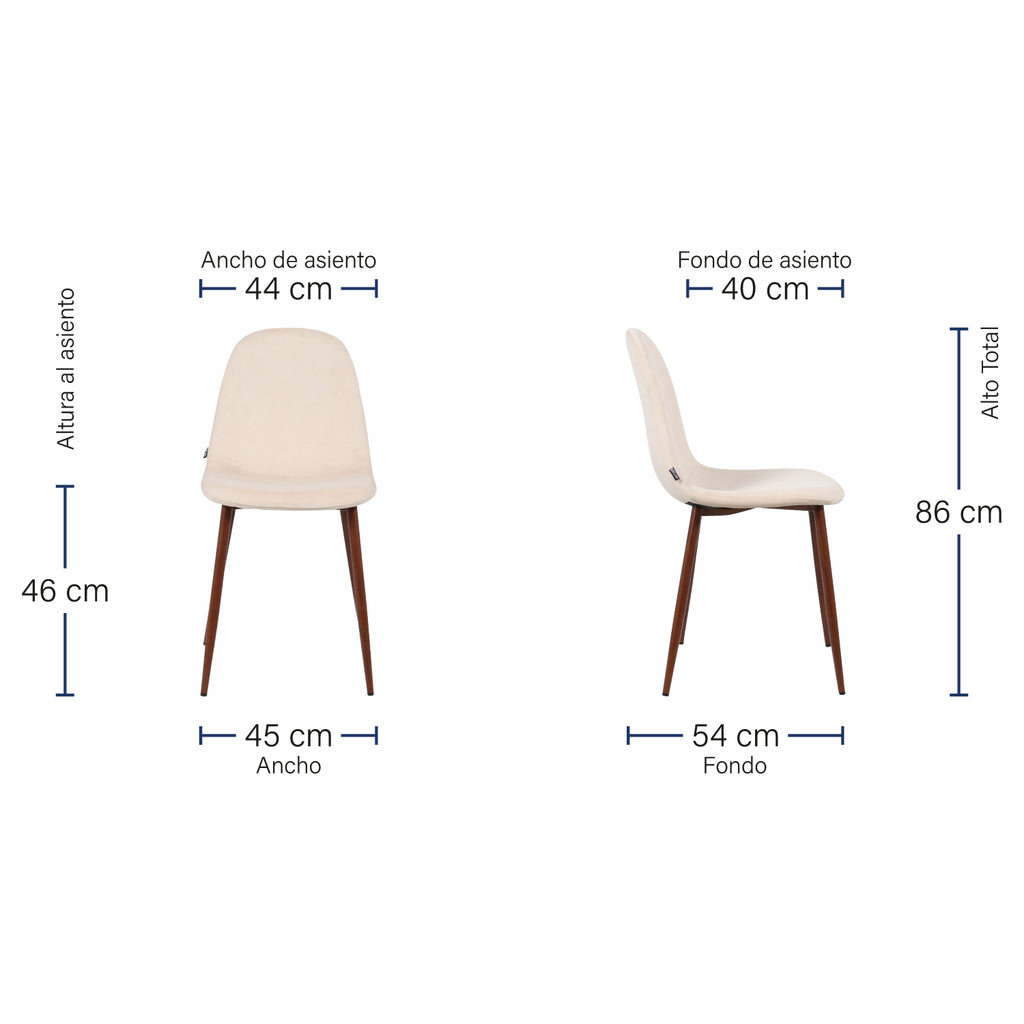 Una robusta estructura de metal en acabado cromado le da a la silla una postura estable. Las patas han sido terminadas en un aspecto madera de nogal.